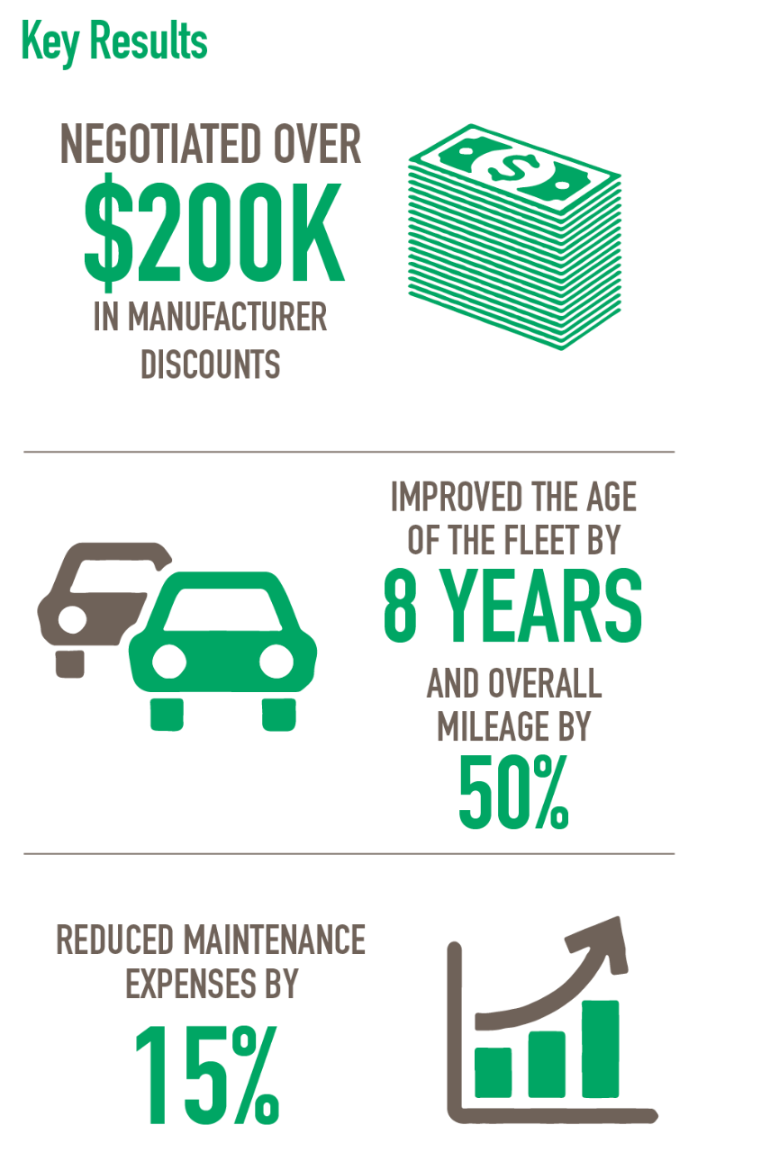 odometer reading has decreased by 50%, and a telematics system was implemented to improve overall visibility, driver safety, and track pertinent vehicle key performance indicators.